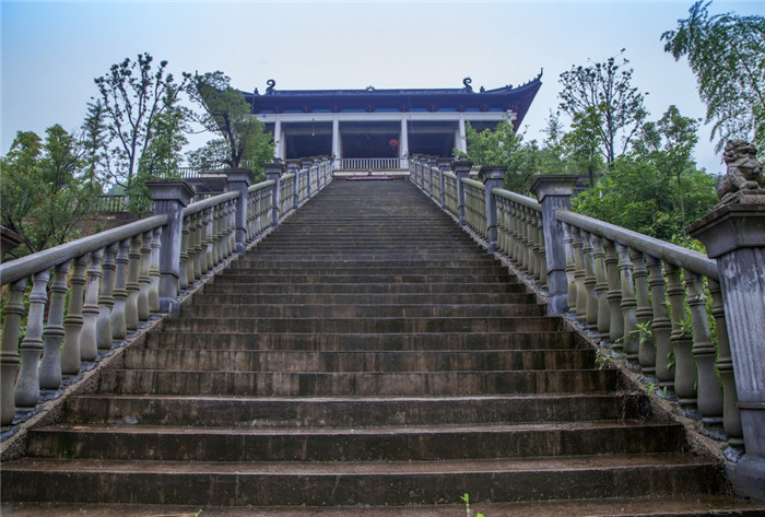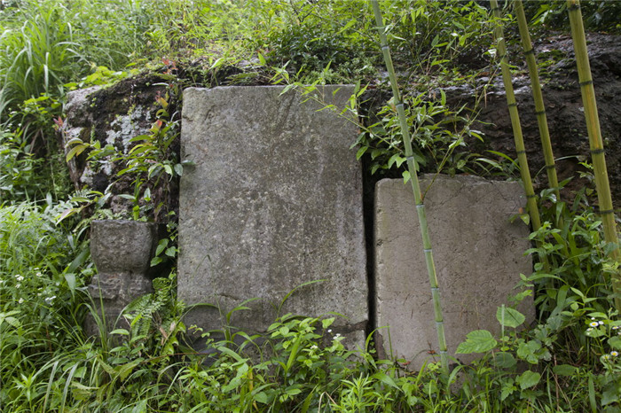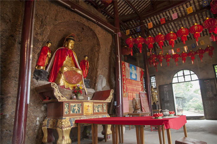 石佛峰左侧有城隍峰对峙,峰极险峻,石色深黛。民间相传唐乾宁二年,董昌僭位,钱谬率兵讨平。里人就立庙于此,以为城隍,故称城隍峰。城隍峰峭壁间,旧有南宋抗金名将韩世忠题“飞跃”两字,字迹苍劲古朴。然而,据清同治《长兴县志》记载,宋元嘉元年,县南六十里“有石佛自川中涌出”,因此建寺取名佛川。其后此寺几度兴衰,宋代改名离相教寺,明初归并广寿寺,清康熙初年重建,现存有乾隆年间的两块石碑,为后人留下其悠长历史的足音。