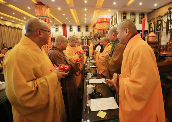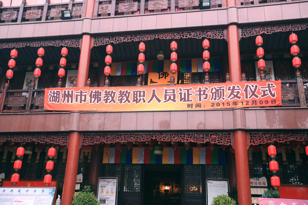 湖州佛教讯:2015年12月09日下午,湖州市民宗局组织指导市佛教协会在湖州法华寺妙法楼举行湖州市佛教教职人员证书颁发仪式。湖州市委统战部副部长、民宗局局长沈火江,民宗局副局长郑峻,民宗局二处处长沈林华以及各县、区民宗局负责人,湖州佛教协会全体理事,湖州市各县、区佛协负责人,法华寺全体僧众,居士代表等,共约100余人参加颁证仪式。