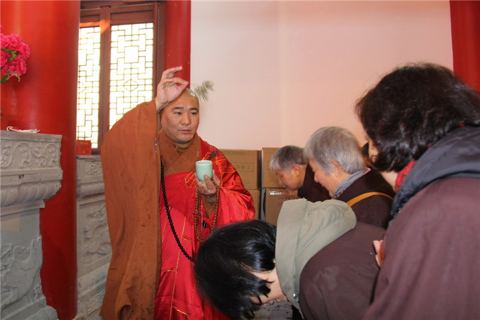 随后,诸位领导及法师们为大雄宝殿落成剪彩,与会四众弟子在界隆大和尚的引领下在大雄宝殿为诸佛菩萨圣像洒净开光。