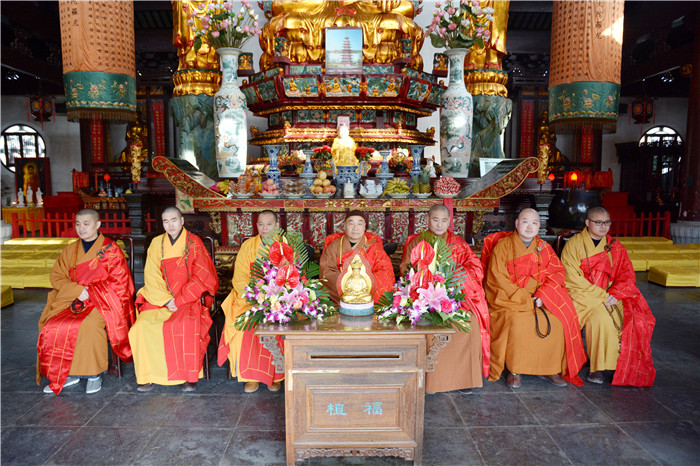 上午吉时良辰,寿圣寺圆成弘法综合楼内,鲜花锦簇,红毡铺地;香云弥漫,梵音嘹亮。两序大众仪仗庄严,八方护法香花迎请南浔佛协会长潮音寺方丈宗慧大和尚,长兴佛协副会长安智法师、证道法师、净因法师,湖州圆证寺住持常戒法师、湖州市佛协办公室主任宗然法师以及长兴佛协会长寿圣寺方丈界隆大和尚等七位大德法师为法会主法。