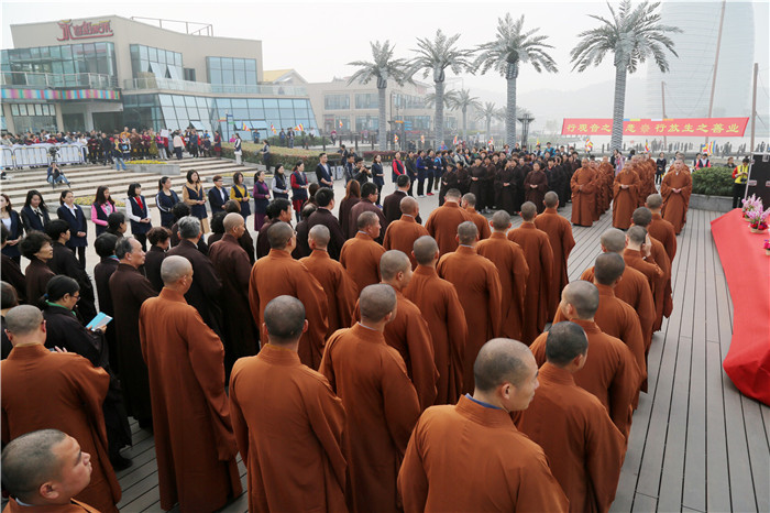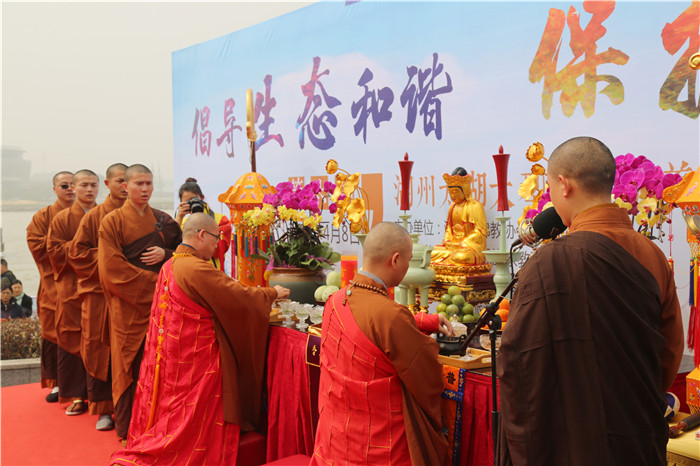 为了深入贯彻落实党的十八大关于“加大自然生态系统和环境保护力度”的精神,积极响应佛教界“合理放生、科学放生”的号召,4月8日,由bet365mobile主办,仁王护国禅寺承办的第六届“倡导生态和谐 保护绿水青山”太湖大型放养护生活动在太湖旅游度假区渔人码头举行。 湖州市委统战部副部长、民宗局局长沈火江;湖州市民宗局副局长郑峻;湖州市民宗局民宗二处处长沈林华;bet365mobile会长慈满法师;第一副会长界隆法师;副会长宗慧法师、智根法师、常进法师;浙江省佛教协会宗淼法师;湖州市佛协常务理事常戒法师;湖州三县两区法师、杭州佛学院学僧、居士、社会贤达以及来自湖州周边城区和本地的市民、爱心企业家、爱心人士800余人等共同参与此次活动。