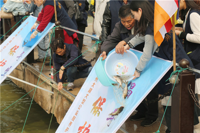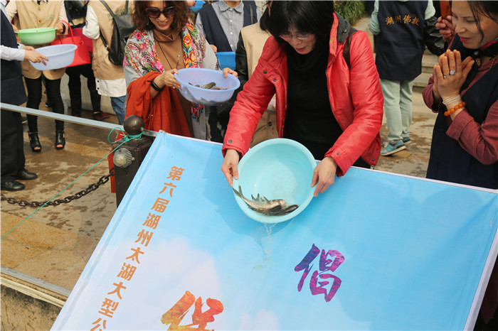 下午2时,慈满会长等七位法师拈香主法,杨枝净水遍洒道场,法会现场梵音盛呗,香火缭绕。随即,在热烈的掌声中,湖州市委统战部副部长、民宗局局长沈火江宣布放生活动开始。 现场众多信众口诵圣号,将手里的鱼苗缓缓放入水中,让这些生命回归自然,看着鱼儿欢快的在水中畅游,在场的嘉宾朋友都无比欣慰。 本次公益放生活动共计投放50万尾食藻鱼苗,对进一步改善太湖水质具有积极的效应,并且通过这次放养护生活动进一步增强了人们对保护生态、注重环保、珍惜水资源的意识。 佛教通过放生等慈善活动来增加大众保护生态、爱护环境、珍惜资源、感恩惜福的理念,同时能美化太湖,造福子孙后代。赋予维持生态平衡、弘扬生命价值理念、追求生活幸福的内涵,体现了科学发展观和建设生态文明的要求,关爱太湖,进一步改善太湖水质,是与湖州人民生活质量息息相关的大事。湖州佛教界高度重视践行护生理念,规范放生行为,为湖州市加快赶超、实现“两高”奋斗目标奉献智慧和力量。 据悉,湖州佛教协会已连续第六年承办公益放养护生活动,每年都邀请佛教界人士以及热心慈善事业的社会企业家和爱心人士的共同参与,受到了各界人士的好评。